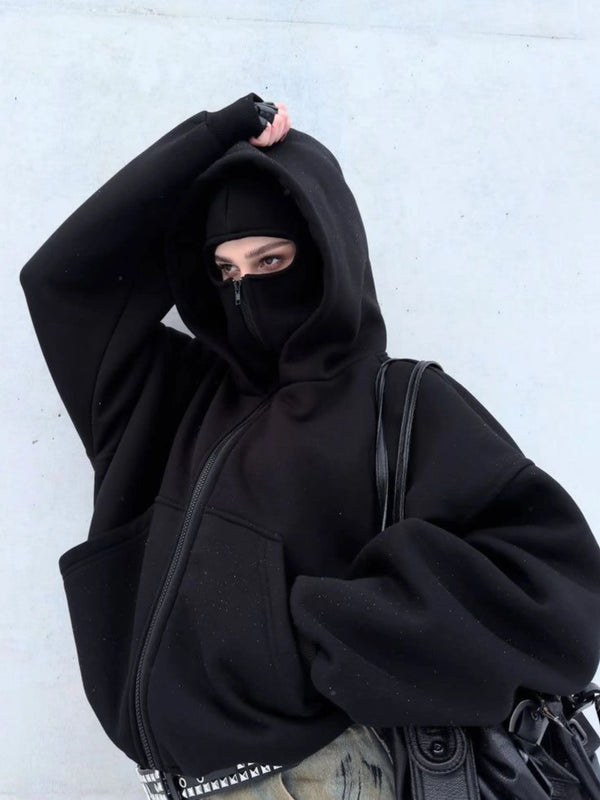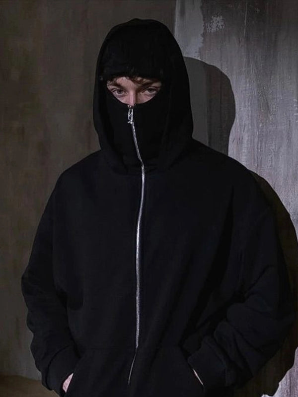 Unlike others, this hooded zip-up sweatshirt jacket pairs a balaclava hood with thick fleece and an oversize cut for warmth, anonymity, and effortless layering in real city life.